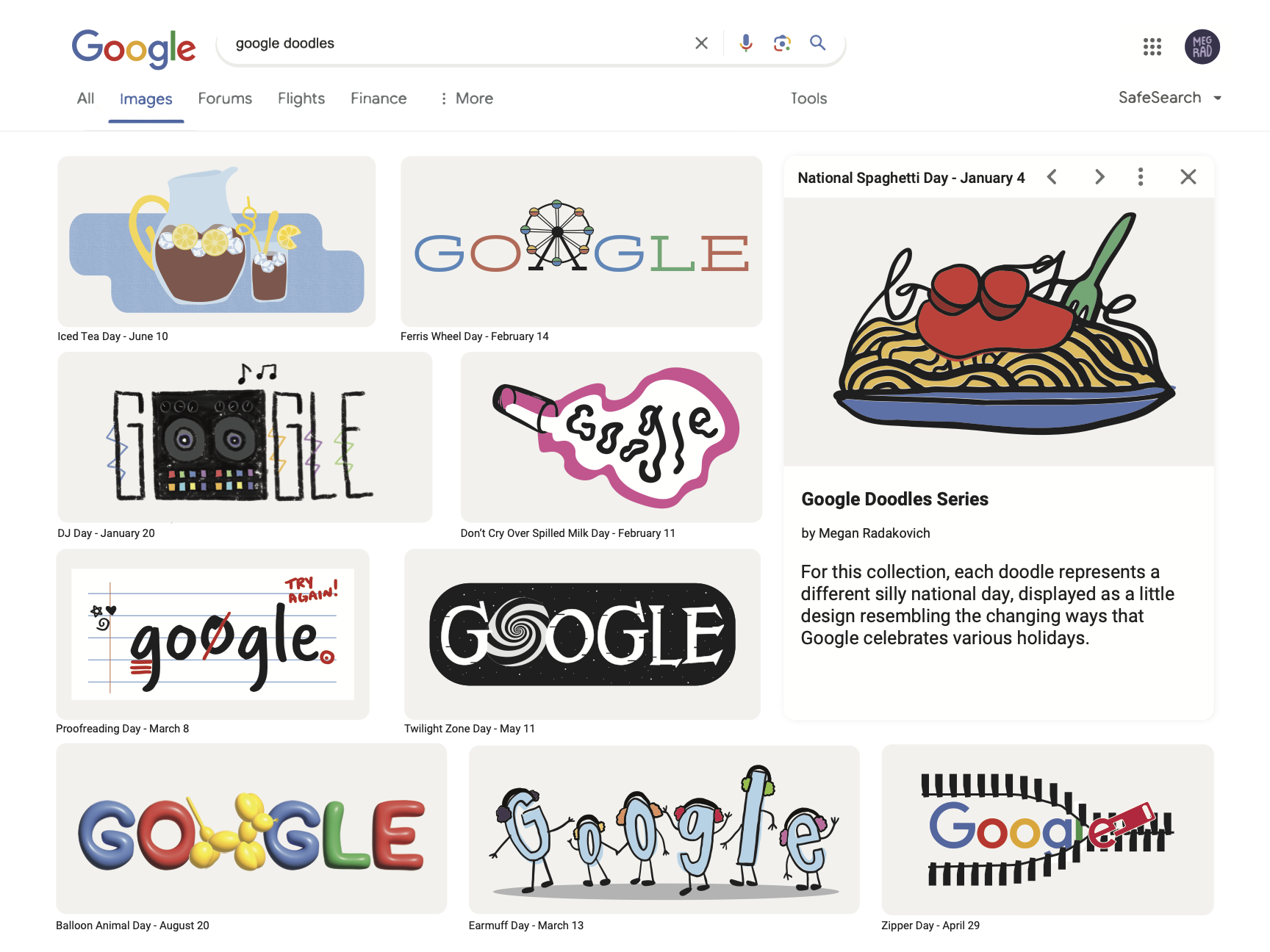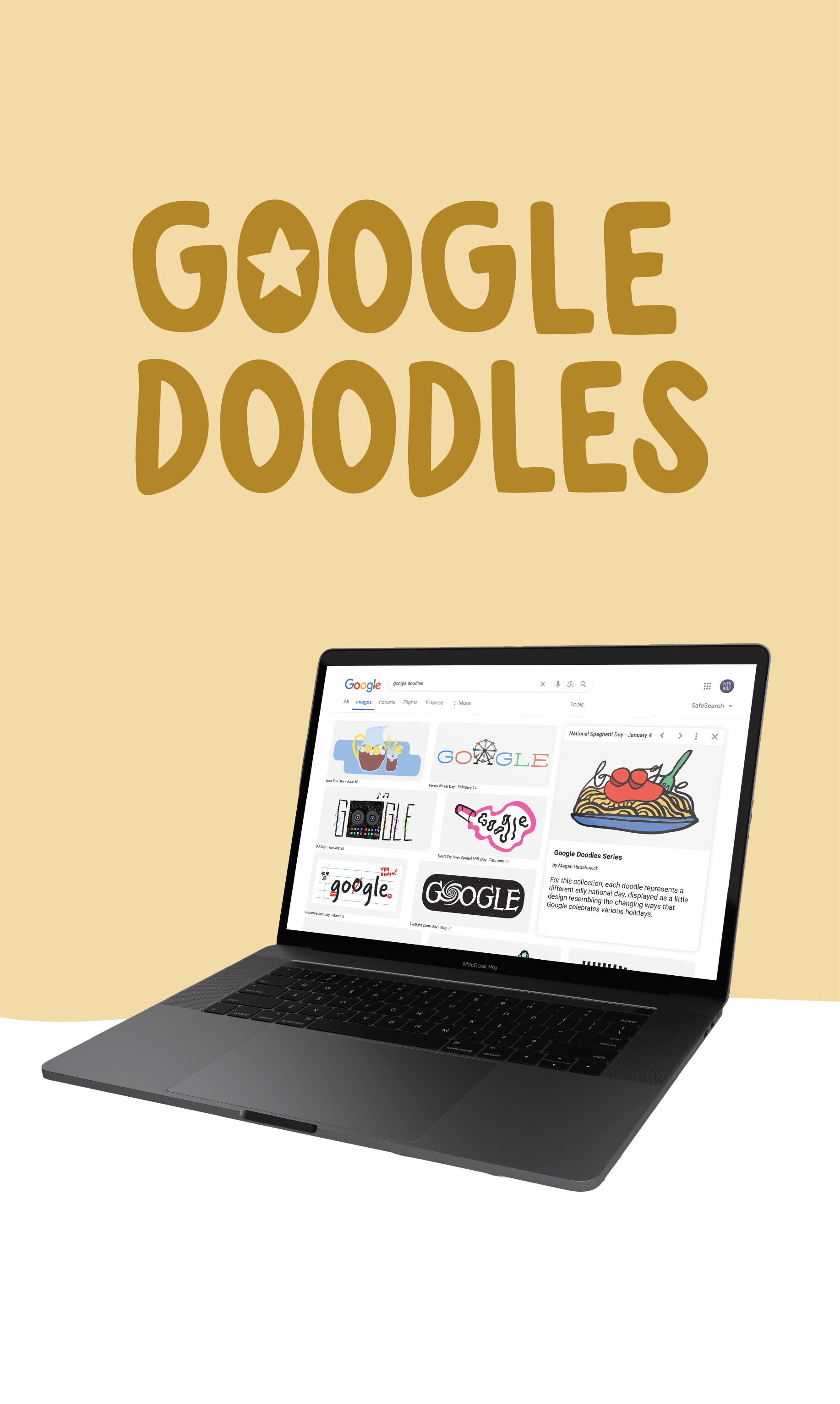 Background: For this project, I chose to create my own “Google Doodles,” the little illustrations that replace the typical Google logo on their search page. To narrow down my doodles, I chose 10 silly national days, such as National Spaghetti Day, and illustrated the letters into objects that represented each holiday.